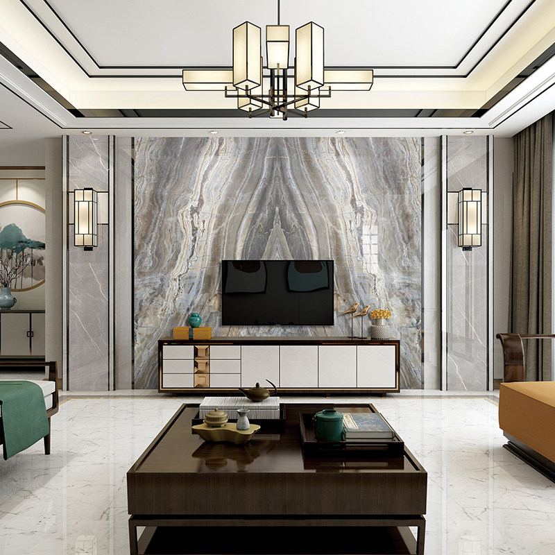 微晶石电视背景墙瓷砖客厅新中式大理石轻奢影视墙边框线热门设计联盟服务商